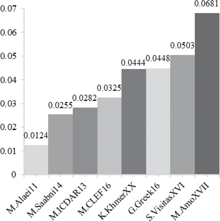 Fig. 1 shows the average TLS-ICI for each collection. As observed, all collections are sorted from lower to higher complexity values. According to the collection, M.AmoXVII shows the highest complexity. Therefore, it would be expected that, in principle, the most sophisticated method performs best the task in this collection. On the other hand, collections of lower complexities (e.g., M.Alaei11 or M.Saabni14) should be analyzed by straightforward TLS methods.