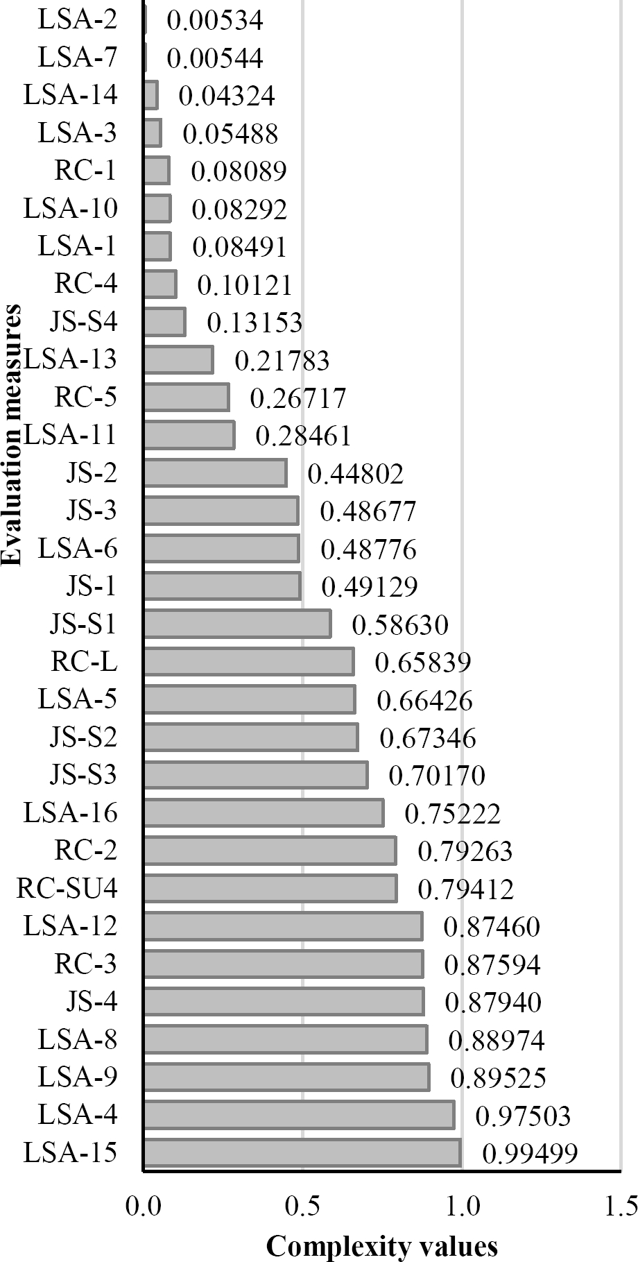 Regarding complexity levels of content measures, Fig. 5 shows an overall ranking of complexity values obtained by the proposed GA to state-of-the-art evaluation measures. In particular, we have observed that the LSA-2, 7, 14, 3, 10, 1, and RC-1 have obtained the lowest complexity values in the ranking, which are lower than 0.1.