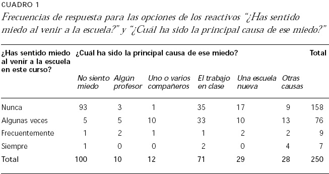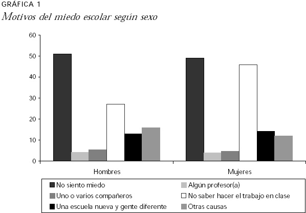 De alguna manera es tranquilizante que los motivos menos importantes para sentir temor al colegio sean los profesores (hombres = 4.2% y mujeres = 3.8%) o los compañeros (hombres = 5% y mujeres = 4.6%); en cambio, se observa como un factor de estrés muy importante el trabajo escolar por sí mismo; aunque quizá no cause sorpresa para quienes están involucrados en tareas educativas que el miedo a no poder desempeñarse adecuadamente en el trabajo escolar sea más frecuente entre mujeres (33.6% del total de la chicas) que entre hombres (23.3% del total de los varones).