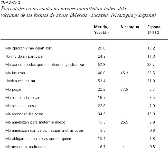 Para efectos de contraste, los datos se resumen en el cuadro 2, que compara los de esta investigación con los obtenidos en Nicaragua (Ortega, 2005) con instrumentos semejantes, aplicados a niños entre tercero y sexto de primaria (el dato refiere a amenazas en general), y con los del trabajo que el Defensor del Pueblo (2007) realizó a nivel nacional en España [considera el segundo grado de Educación Secundaria Obligatoria (ESO)].