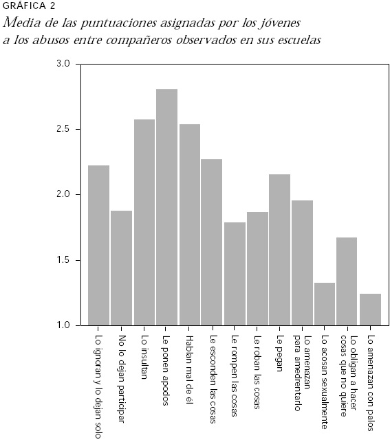 La agresión verbal fue la forma más común de abuso entre iguales según la percepción de los estudiantes. De acuerdo con lo que se reporta, es una forma de violencia muy extendida: 85.4% observa la presencia de apodos ofensivos entre sus compañeros y 85.5% da cuenta de que sus compañeros hablan mal los unos de los otros. Para ambas conductas, la moda entre los jóvenes fue responder "siempre". Los insultos, aun cuando son menos frecuentes que las otras formas de agresión, también representan una práctica muy extendida, 78.2% de los observadores reportan su existencia en las escuelas.