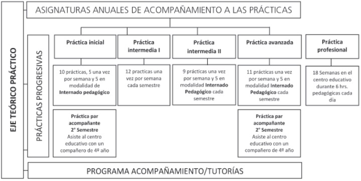 Esta progresión se refleja en la formación práctica intencionada en el plan de estudio (Figura 1), lo que se traduce en que el ejercicio docente se lleva a cabo en los ambientes pedagógicos teóricos (universidades) y prácticos (escuelas) (Solís, Núñez Vega, Contreras, Rittershaussen et al., 2011).