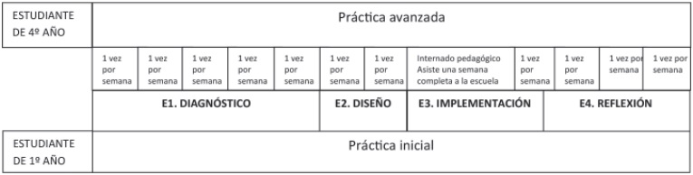 La primera etapa consiste en la elaboración de un diagnóstico del centro educativo en conjunto, mientras la segunda consta de la elaboración de un diseño didáctico para su posterior intervención, donde ambos estudiantes, tanto de primero como de cuarto años, complementan las actividades a desarrollar en la práctica; la tercera etapa radica en la implementación del diseño didáctico, que se pone en marcha durante la semana de internado pedagógico; este último consiste en ir una semana completa al establecimiento y realizar la intervención del diseño previamente elaborado. En la cuarta etapa, los estudiantes de ambos años reflexionan sobre lo ocurrido en las intervenciones, sobre las decisiones tomadas y acciones ejecutadas, tanto de las que dieron resultado, como de las que no.