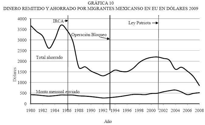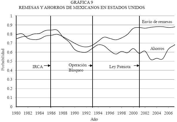 Estas tendencias tienen efectos considerables en México, dado que con el pasar de los años cada vez es más dependiente de los 'migradólares' (Durand, 1988), es decir, de las remesas que envían los migrantes a sus familias. El flujo de migradólares depende no sólo del número de migrantes radicados en Estados Unidos, sino también de su propensión a enviar remesas. La gráfica 9 muestra las probabilidades de enviar remesas y de regresar con ahorros a México. Antes de IRCA, la probabilidad de enviar remesas y regresar con ahorros era bastante alta (80 por ciento). Pero después de 1986, las dos tendencias empiezan a bajar hasta una probabilidad de 67 por ciento en remesas y 60 por ciento de retorno con ahorros. Después de 1993 las probabilidades de remitir aumentan considerablemente hasta 90 por ciento, mientras que las probabilidades de retornar con ahorros descienden.