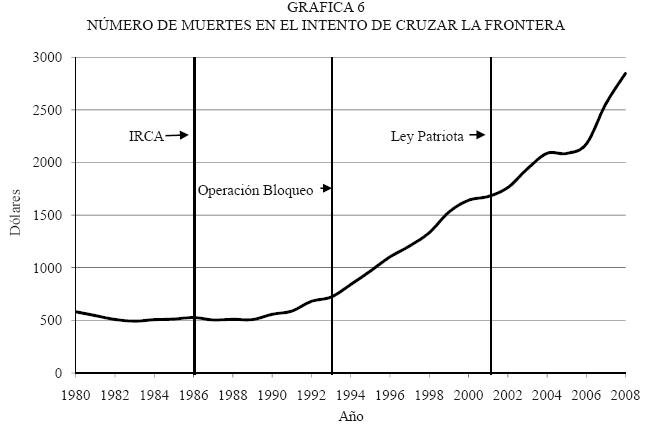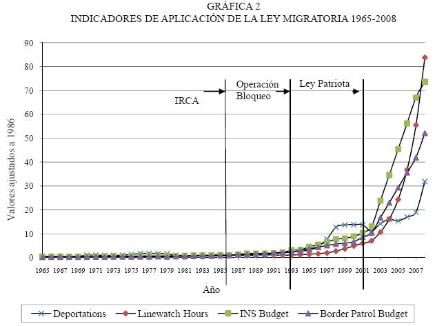 El escalamiento de la guerra antimigrante queda claramente ejemplificado en la gráfica 2, donde se muestra la nueva tendencia en las deportaciones, el incremento en el presupuesto de la Patrulla Fronteriza y el INS, y el número de horas de vigilancia fronteriza entre los años de 1965 y 2008. Cada serie se ajusta a valores de 1986. De acuerdo con la gráfica 2, entre 1965 y 1986 prácticamente no hay cambios, éstos empiezan a manifestarse lentamente hasta 1993 y 1994, año en que se ponen en efecto las operaciones Bloqueo, en El Paso, y Guardián, en San Diego. Sin embargo es en 2002, después del 11 de septiembre, cuando la curva cambia radicalmente y todos los indicadores se disparan. En 2008, el número de horas de vigilancia fronteriza pasó de cero a un factor de 74, el presupuesto de la Patrulla Fronteriza creció con un factor de 52 y las deportaciones con un factor de 32.