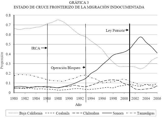 Entre 1980 y 1988, la mayoría de los migrantes indocumentados cruzaba por el estado de Baja California. Después de IRCA, esta situación empieza a declinar y crecen los cruces por el estado de Tamaulipas, pero es en 1983 cuando se transforma el panorama, comienza a despuntar Sonora y se establece el corredor por el desierto de Altar hasta Phoenix, Arizona. Mientras en 1980 tan sólo seis por ciento de la migración indocumentada pasaba por Sonora, en 2003 lo hacía 58 por ciento.