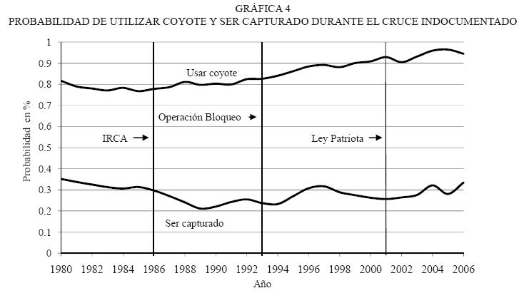 Se incrementaron los costos y los riesgos del cruce subrepticio y al mismo tiempo crecieron, de manera muy significativa, las medidas de control fronterizo. Sin embargo, las probabilidades de ser capturados han variado poco. En 1980 se estimaba en 33 por ciento la probabilidad de cruzar con éxito, para 1994 fluctúa entre 20 y 25 por ciento, y vuelve a mejorar para alcanzar 31 por ciento. A pesar del incremento notable del presupuesto de la Patrulla Fronteriza y todas las medidas de control tomadas, las probabilidades de cruzar con éxito permanecen sin mayores variantes.