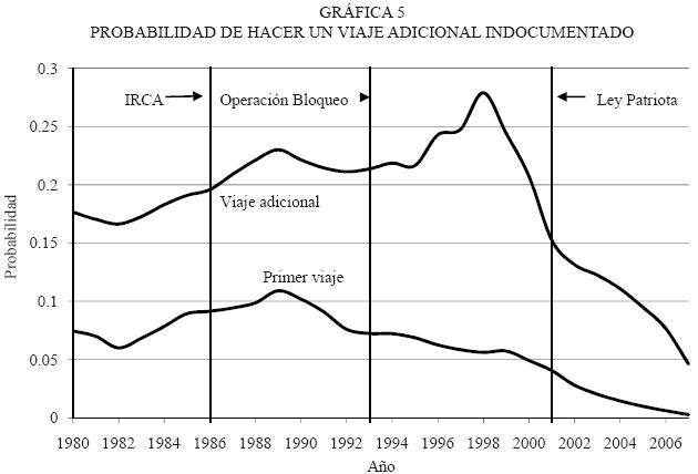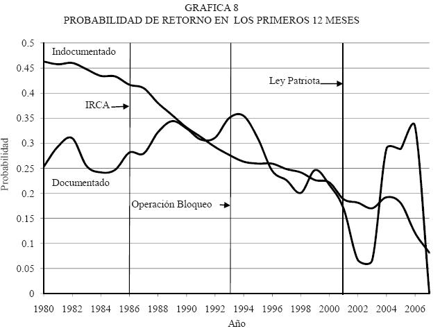 Después de 1998, la probabilidad de migrar empieza a declinar y esta caída se hace más pronunciada luego del 11 de septiembre y la promulgación de la Ley Patriota, que impulsa de manera dramática las medidas de control fronterizo y las redadas al interior del país norteamericano. Para 2007 varios factores operan de manera simultánea en la disminución del flujo migratorio: la política migratoria de corte disuasivo, la crisis económica, el desempleo y nuevas oportunidades de migración legal para trabajadores temporales. Todos estos factores inciden en una baja sustancial del flujo migratorio indocumentado.