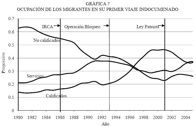 Como puede suponerse, al bajar las probabilidades de iniciar una nueva aventura migratoria, el aumento en los costos y los riesgos del cruce fronterizo han generado un proceso de selectividad en aquéllos que deciden o tienen posibilidades de migrar. La gráfica 7 muestra los cambios que se han dado en las opciones ocupacionales de los migrantes en tres categorías para el periodo 19802005. Antes de IRCA, la mayoría de los migrantes en su primer viaje eran poco calificados (aproximadamente 64 por ciento en 1982). Pero esta proporción ha ido decreciendo a medida que pasan los años. Para 1993, el personal migrante no calificado era de 40 por ciento, y la tendencia a la baja se mantuvo y llegó a 22 por ciento en el año 2001. Para el mismo periodo, la proporción de migrantes que se emplean en servicios empieza a crecer y pasa de 20 por ciento en 1980 a 38 por ciento en 1981, y posteriormente empieza a declinar hasta llegar a 30 por ciento en 2001. Por su parte, el ingreso de migrantes calificados empieza crecer a partir de IRCA, y la tendencia se dispara después de 1993 y llega a su máximo (47 por ciento) en 2001.
