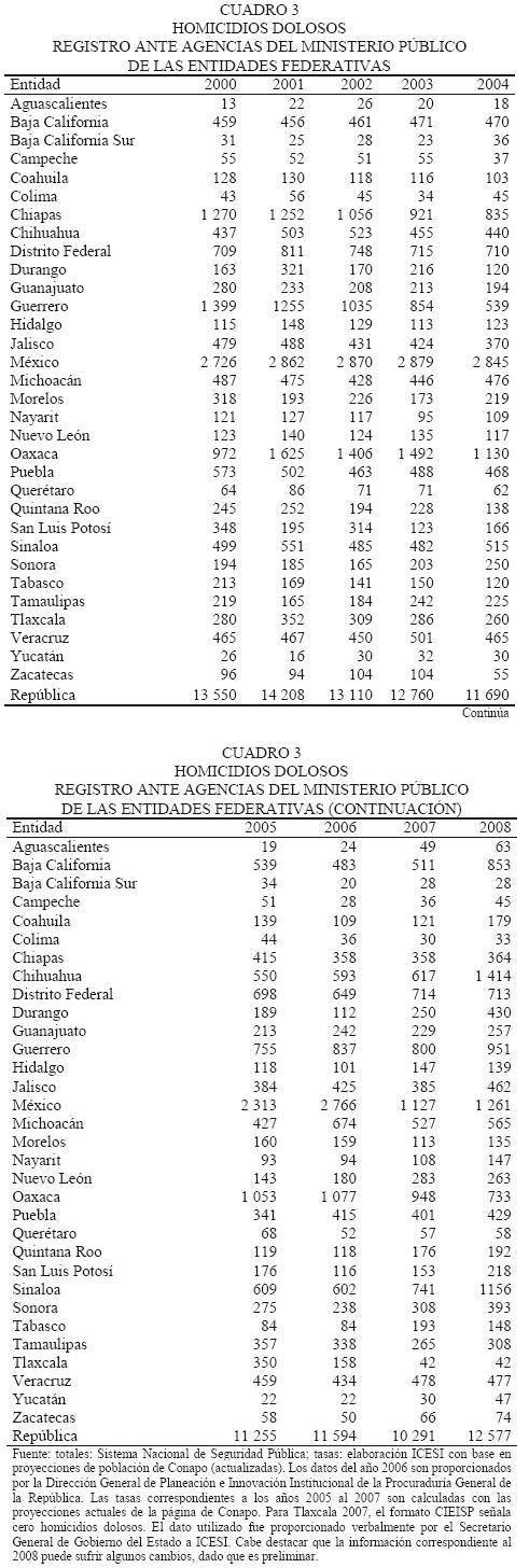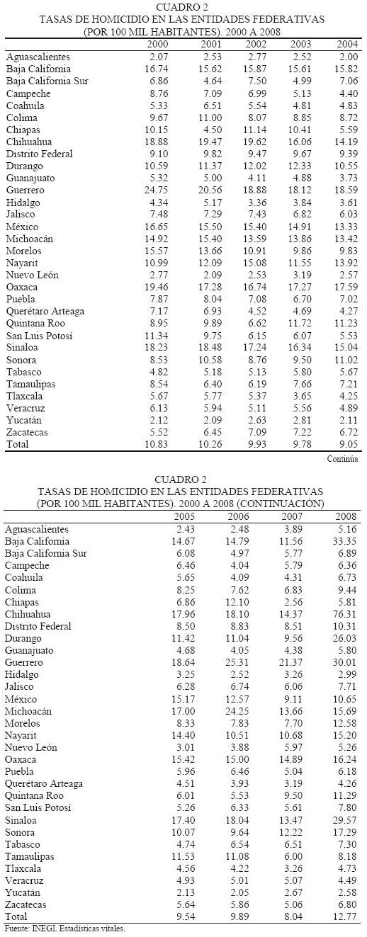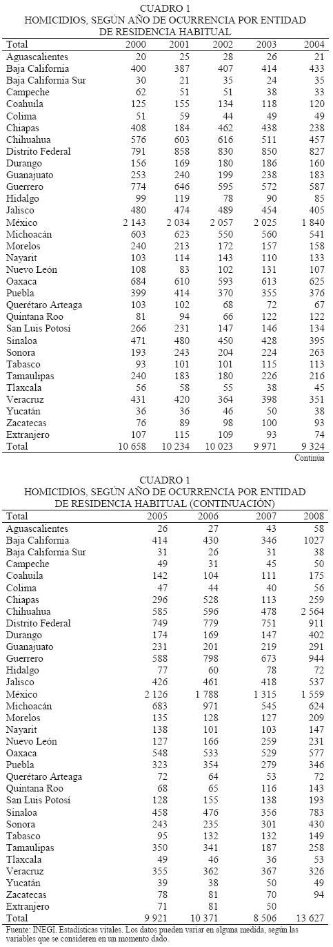 We present a review of the occurrence of homicides in Mexico for the 20002008 period, which was undertaken on the basis of vital statistics data from the National Institute of Geography, Statistics and Computing and the National System of Public Security; the sources present significant differences between each other: the amount differs, on average, in two thousand casualties yearly, which represent circa 1520 percent of the annual figure of homicides; nevertheless, they agree on pointing out the year 2008 as the moment of upturning for this kind of crimes in the Mexican Republic, particularly in five federal states: Baja California, Chihuahua, Durango, Guerrero and Sinaloa. We underscore the fact that the increment of homicides arises after applying a governmental strategy of frontal fight against organized crime started in 2007.