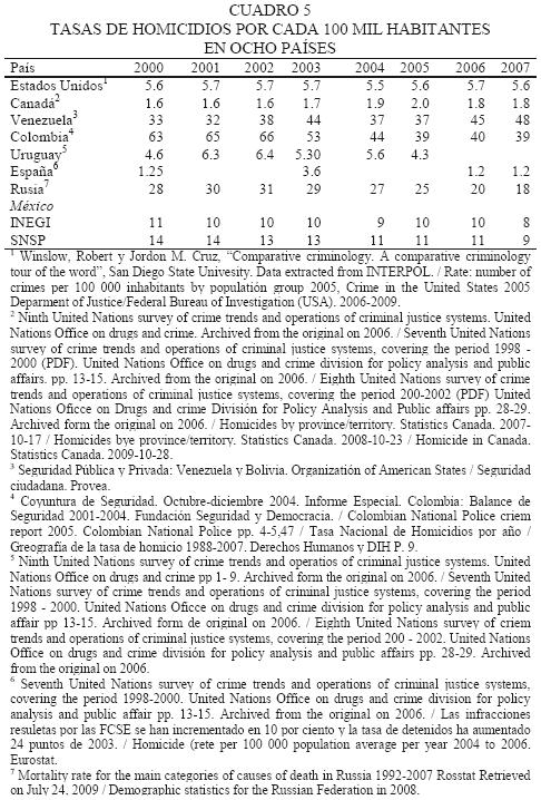 Comparado con países de Sudamérica como Venezuela y Colombia (cuadro 5), México presenta hacia 2007 niveles muy inferiores de homicidio, aunque también en Sudamérica se encuentran algunos de los países con menores tasas de homicidio del continente, como lo muestra Uruguay. En Norteamérica, México presenta niveles considerablemente más altos que Estados Unidos y, particularmente, que Canadá. Es en el continente americano donde se registran los más altos niveles de homicidio del mundo. Al interior, como se aprecia, los contrastes son notables, ubicándose México en una situación intermedia dentro del continente.