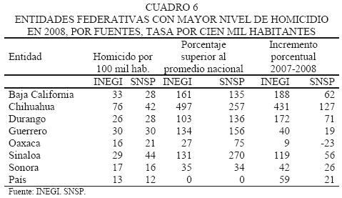 En las dos fuentes consideradas (INEGI y SNSP), son coincidentes las entidades federativas que presentan los mayores niveles de homicidios en el país. Estas se muestran en el cuadro 6.