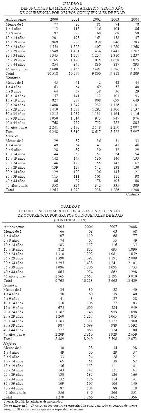 Los homicidios explican alrededor de 1.5 por ciento del total de muertes en nuestro país. De acuerdo con las estadísticas vitales (INEGI), el número de homicidios registrados entre 2000 y 2007 no presentó grandes variaciones, pero en 2008 se registra un incremento significativo (de 60 por ciento) que ubicaría el monto de homicidios en 13 607 (cuadro 1), lo que implica alrededor de 13 homicidios por cada cien mil habitantes (cuadro 2). Este incremento rompe la tendencia relativamente estable o a la baja que había mostrado la tasa de homicidios en años anteriores.
