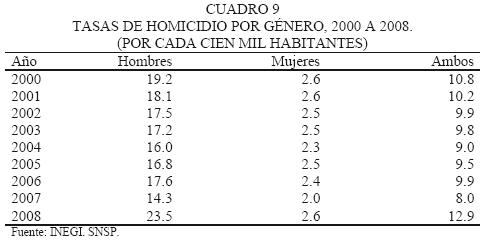 El homicidio en México es un fenómeno que padecen tanto hombres como mujeres, aunque hay diferencias dignas de ser consideradas (cuadro 8). El homicidio impacta preponderantemente a los hombres, sin que la proporción por género cambie significativamente en los años analizados: los asesinatos de hombres explican entre 87 y 90 por ciento de todos los homicidios.