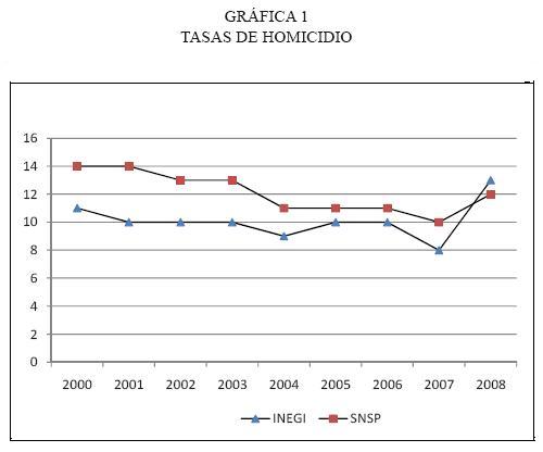 De igual forma, los datos del SNSP muestran que la tendencia a la reducción del fenómeno es constante hasta 2007, pasando la tasa de homicidios de 14 a 10 por cien mil habitantes. Sin embargo, esta misma fuente consigna un nuevo repunte del nivel (12 por cien mil) hacia 2008 (véanse los cuadros 3 y 4, gráfica 1).