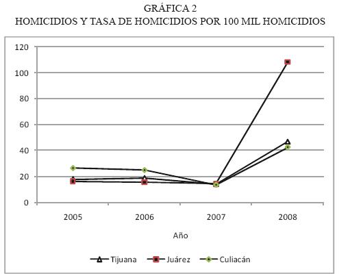 En los tres estados señalados es particularmente grave la situación de tres municipios en 2008: Ciudad Juárez, con una tasa de homicidios de 108 por cada cien mil habitantes; Tijuana, con 47 por cien mil, y Culiacán, con 42 por cien mil. Estas regiones, sin duda se ubican entre las más violentas del mundo.