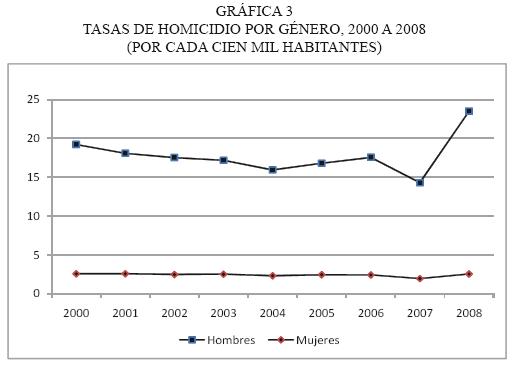 Tal y como ocurre con los datos de todo el país, la tasa de homicidios, tanto para hombres como para mujeres, presenta a lo largo de casi toda la década del 2000, una tendencia a la estabilidad o ligeramente a la baja (cuadro 9 y gráfica 3). Pero en 2008 la situación cambia: la tasa de homicidios para hombres y mujeres se incrementa en 64 y 30 por ciento, respectivamente. Es decir, queda claro que el incremento de la violencia expresada en el nivel de homicidios para el último año, si bien impacta particularmente a los hombres, ha involucrado también a la población femenina, en forma tal que su tasa ha regresado a los niveles prevalecientes en el 2000. 335 asesinatos más de mujeres en un solo año no son poca cosa: es casi una muerte diaria adicional.