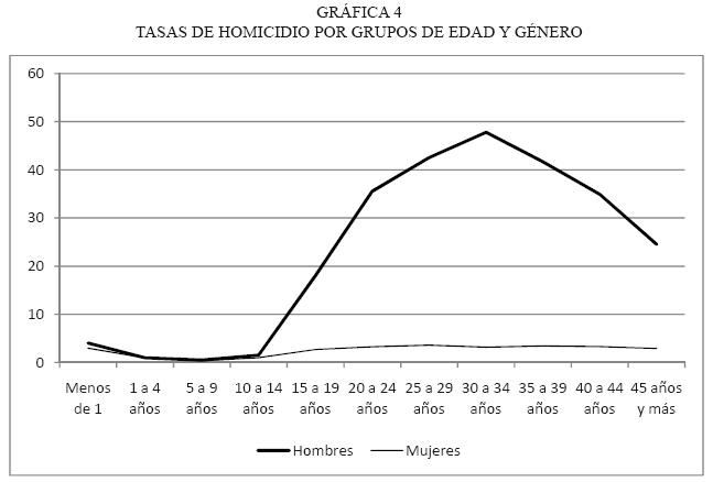 5 Estas diferencias por edad y género no presentan grandes variantes a lo largo del tiempo, según se reporta en un estudio del homicidio entre 1950 y 1982 (Hernández, 1989).