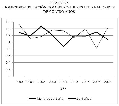• Comparativamente con los hombres, la proporción de homicidios de menores de 15 años es mucho mayor: 11 por ciento del total. Antes de los cinco años no existe gran diferencia en los montos de homicidios entre los sexos: la relación hombre/mujer entre las víctimas de homicidio es muy cercana a uno; incluso, en dos de los años analizados es mayor para las mujeres (gráfica 5).5