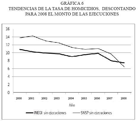 Si se asume el supuesto de que la lucha contra el crimen organizado no se hubiera verificado y que por tanto no se hubiera dado un quiebre al alza en la tendencia del homicidio, observamos en la gráfica 6 lo que ocurriría con esa tendencia. Si se descuenta este efecto, las cifras en 2008 serían 7 966 homicidios y no 13 627 (según datos del INEGI), o 6 916 y no 12 577 (SNSP).