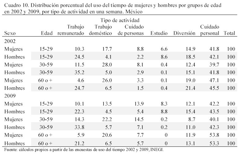 Mientras tanto, ante la reducción de la acción del Estado y los intentos por privatizar los servicios de atención a la salud, la familia ha tenido que asumir el cuidado de los adultos mayores. Esto se constata con la información que muestra el tiempo dedicado a diversas actividades en el hogar, que ofrecen las Encuestas Nacionales sobre Uso del Tiempo y que muestran entre los años 2002 y 2009 el incremento en el tiempo dedicado al cuidado de los viejos, especialmente el que ocupan las mujeres en esa tarea (Cuadro 10).