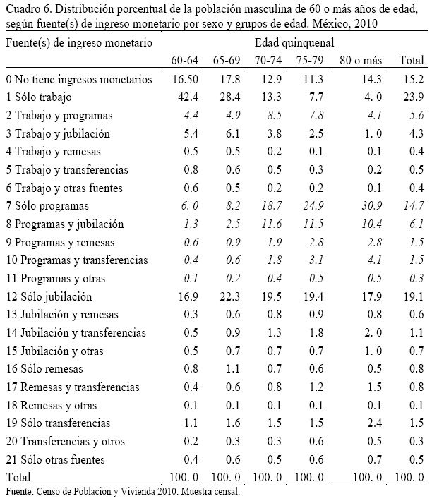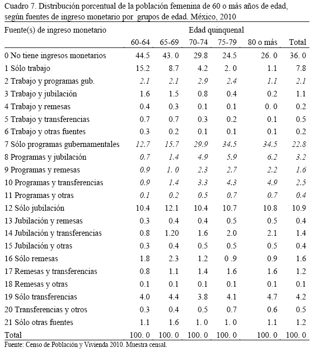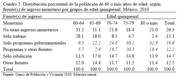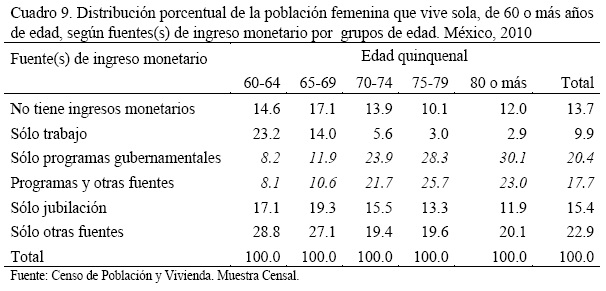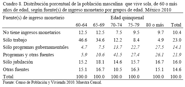 Cuando se considera a la población total, es posible suponer que la sobrevivencia de los individuos que carecen de un ingreso monetario depende del soporte familiar o de las transferencias que en especie reciben de otras personas. Sin embargo, cuando la observación se restringe a las personas que viven solas, la situación es francamente dramática, porque 12 por ciento de ellas no tiene ingresos monetarios, 37.1 por ciento recibe ingresos de algún programa gubernamental y para 17.7 por ciento, su único ingreso monetario proviene de los programas gubernamentales.