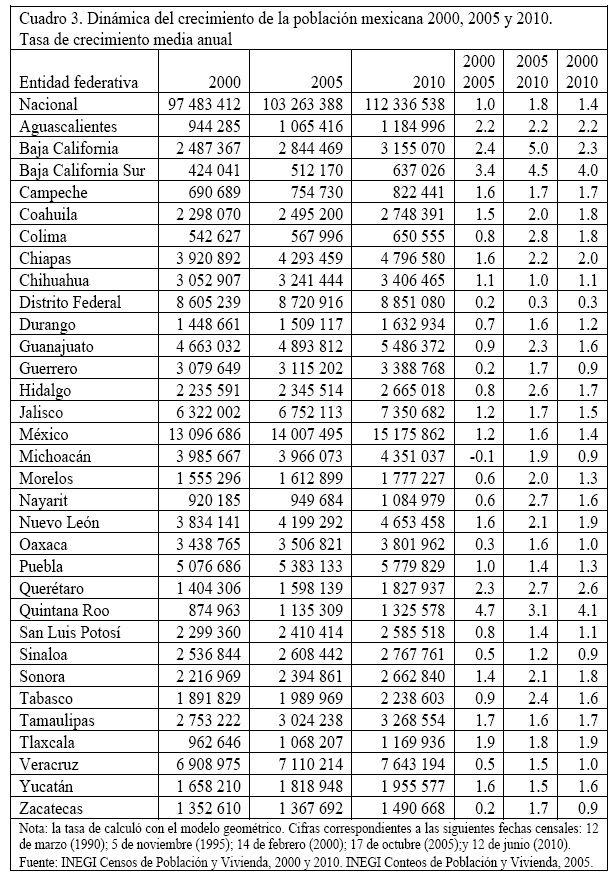 Considerando la dinámica de población de 2000/2010, el Distrito Federal es el que presenta una tasa de crecimiento promedio anual cercano a cero, apenas de 0.3 por ciento. En un segundo grupo se encuentran las entidades de Sinaloa con 0.9 por ciento, Michoacán con 0.9 por ciento, Guerrero con 0.9 por ciento y Zacatecas con 0.9 por ciento (INEGI, Censo de Población y Vivienda, 2000 y 2010). Pero si dividimos la década en sus dos lustros, encontramos panoramas distintos: entre 2000-2005, las entidades en su dinámica poblacional que experimentaron el crecimiento más bajo fueron: Michoacán (-0.1 por ciento), Zacatecas (0.2 por ciento), Guerrero (0.2 por ciento), Distrito Federal (0.2) y Sinaloa (0.5 por ciento); en cambio, entre 2005-2010 sólo el Distrito Federal mantuvo un crecimiento bajo, equivalente a 0.3 por ciento (INEGI, Censo de Población y Vivienda, 2000 y 2010, II Conteo de Población 2005). Por supuesto, esta es una tendencia nacional que entre 2005-2010 se manifiesta globalmente en una tasa anual de crecimiento promedio de la dinámica poblacional de 1.8 por ciento, superior en 0.8 por ciento respecto de la experimentada en 2000/2005, lo que resulta paradójico, ya que desde 1960 en cada censo de población se había mantenido una tendencia de crecimiento poblacional descendente.