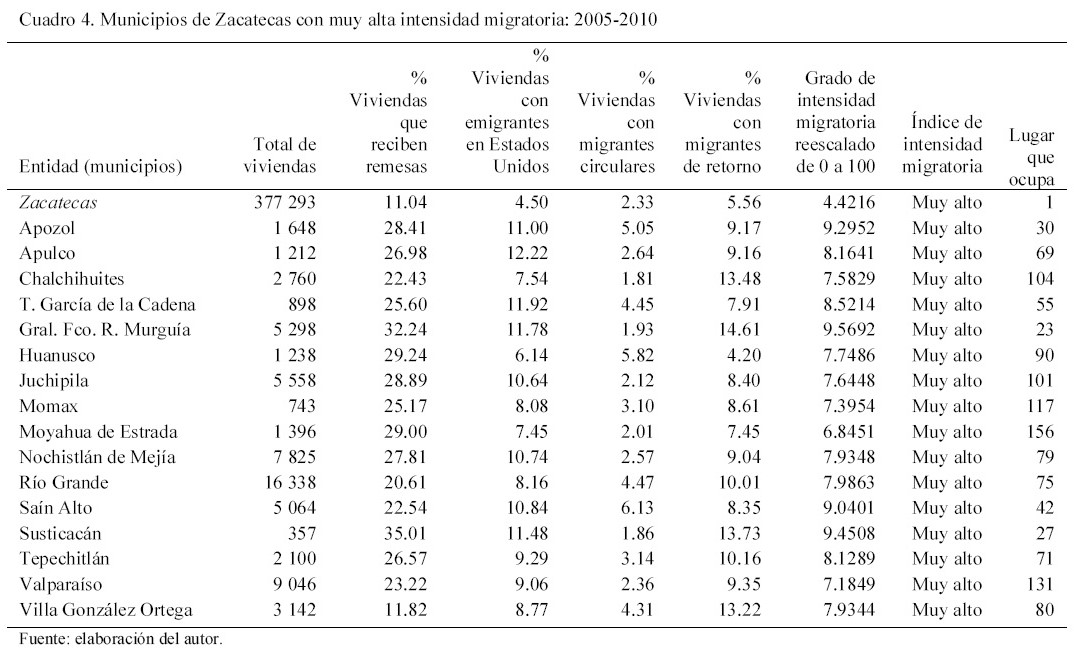 En 2010 se produjeron algunas variaciones regionales, pero los cambios que destacan en las tres primeras regiones es la fuerte disminución del migrante establecido en Estados Unidos y el aumento de la migración de retorno. No obstante, hay que subrayar que en la región histórica de la migración estas variaciones son más intensas, mientras que en la región de transición de la migración son más moderadas. Y es que en aquélla, los efectos de la migración son más intensos debido al peso que en la misma presenta el Índice de Intensidad Migratoria. Los municipios del Cuadro 4, con excepción de Francisco R. Murguía, Río Grande, Saín Alto y Villa González Ortega, corresponden a la región histórica de la migración, lo que confirma en ella la intensidad de los efectos.