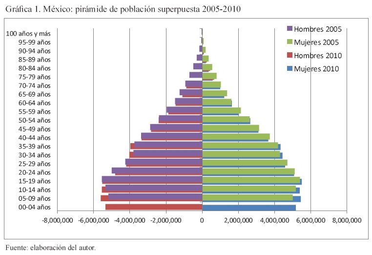 4 En este caso se superponen los grupos etarios de 2010 con el grupo etario anterior de 2005, por ejemplo, el grupo de 05-09 correspondiente a 2010 respecto del grupo 00-04 de 2005 y así sucesivamente. Se trata de un procedimiento metodológico que mide la misma población cinco años atrás, identificando sus variaciones en donde el supuesto es que ya no hubo crecimiento por nuevos nacimientos.
