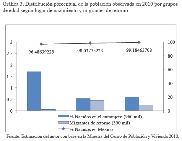 Ahora bien, el crecimiento no previsto para 2010 obedece al freno que experimentó la migración, el retorno de los migrantes, el crecimiento de la inmigración, en este caso de los descendientes de migrantes que ingresaron por primera vez con sus padres a México, quienes a pesar de ser binacionales fueron registrados como "extranjeros".