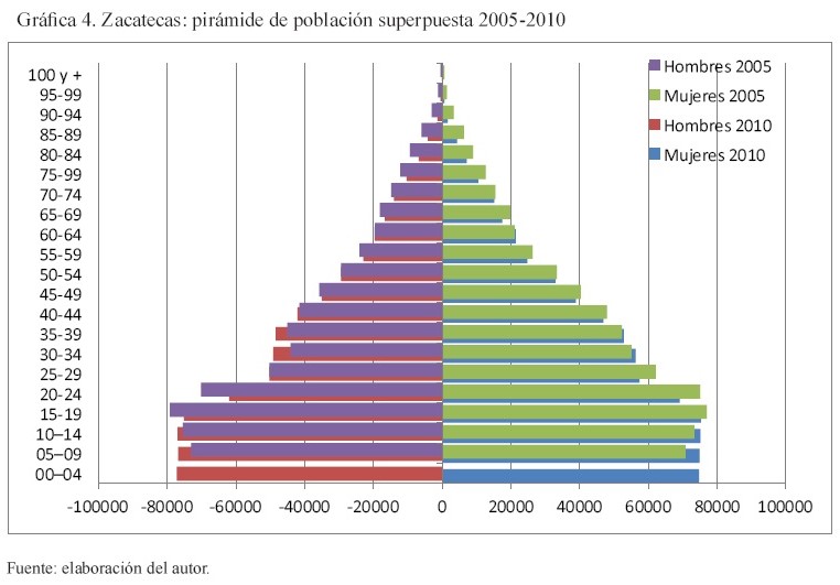 Otra distinción regional asociada directamente al proceso del despoblamiento acumulado que experimentó Zacatecas hasta 2005, es un fenómeno típico que afectó de manera dramática a los grupos de edades que se veían mayormente impactados por la emigración internacional, como sucedió con los segmentos de la población comprendidos entre 20-24 y 25-29 años. En efecto, en 2005 en el grupo de edades de 25-29 años, el municipio de Apulco tenía solamente 49 varones por cada 100 mujeres, Susticacán 53, Concepción del Oro 56, Nochistlán y Valparaíso 59; es decir, en estas municipalidades existía un déficit de varones que ya indicaba que la reproducción de la población se había convertido en un problema para la sustentabilidad social y reproductiva, pues encontrar pareja entre las jóvenes de algunas localidades se convirtió en una seria dificultad.