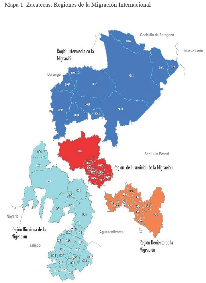 En el estado de Zacatecas se cuenta con una regionalización de la migración internacional basada esencialmente en la antigüedad espacial del fenómeno migratorio, misma que distingue cuatro regiones: región histórica (Sur-occidente), región intermedia (norte), región reciente (sureste) y región de transición (centro) (Moctezuma, 2004).