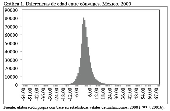 En México, la baja de la fecundidad se dio sin grandes movimientos en la edad media al matrimonio, la cual es diferencial por sexo. Este aspecto podría impactar en las brechas de edad entre cónyuges, propiciando un aumento de homogamia cronológica que tradicionalmente era baja, pues el patrón imperante era que el hombre se casaba con una mujer de menor edad que él. Dos de los indicadores utilizados en este análisis tanto en sociedades premodernas como en las actuales, son la edad de los cónyuges al momento de la unión y las diferencias de edad entre ellos. Estos indicadores sirven para detectar posibles cambios en la estructura de las poblaciones casaderas o en las preferencias matrimoniales, aspecto que se considera ligado a una dimensión de género. Esta dimensión infiere una relación de poder al interior de las parejas analizada a través de las diferencias de edad entre cónyuges (Quilodrán, 2001a: 253).