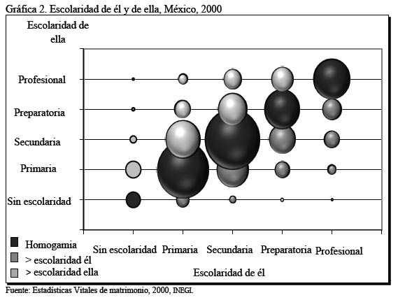 La hipergamia presenta niveles de 18.6 por ciento y la hipogamia de 23.4 por ciento. De esta manera, se concluye que el patrón de casamiento en cuanto a nivel escolar de las parejas formadas en México en 2000, es el de la homogamia. Nuevamente llama la atención la importante proporción de matrimonios donde las mujeres tienen más escolaridad que los hombres, poco menos de uno de cada cinco matrimonios, lo que habla de una sobrecalificación educativa femenina.