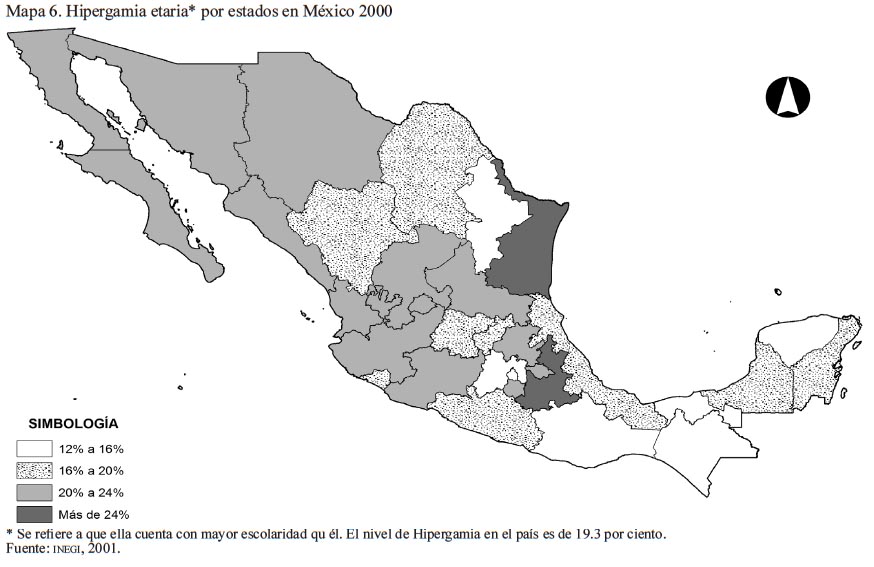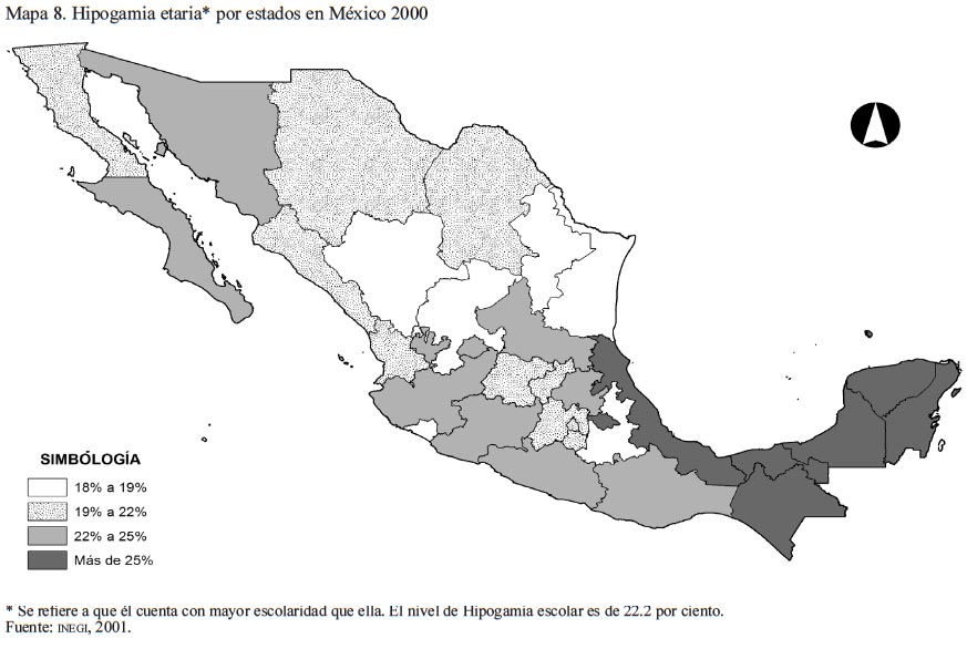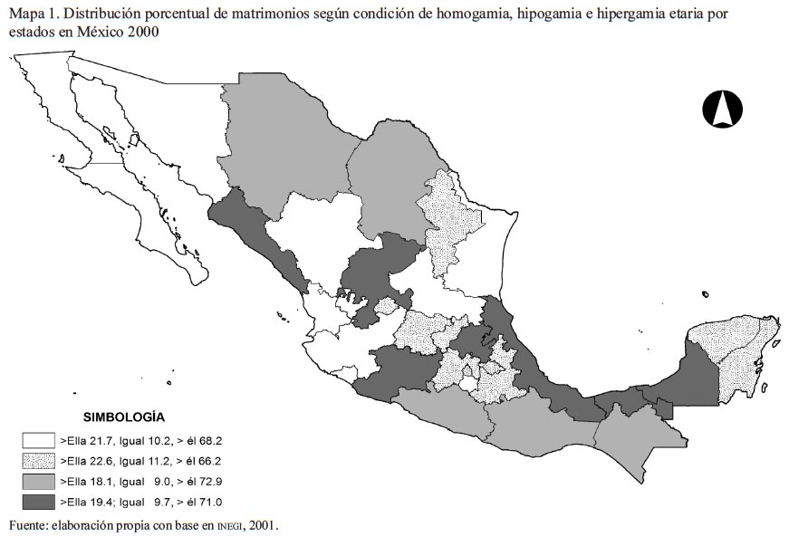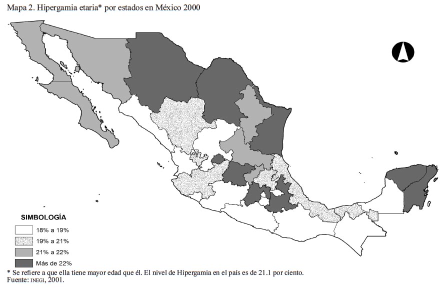 En el Mapa 2 se puede observar que del total del país, casi una quinta parte de los matrimonios responde a la "norma tradicional" de que el hombre es mayor en edad que la mujer en la pareja conyugal. Sin embargo, el resultado que más llama la atención es el que se refiere a los niveles de hipergamia etaria obtenidos, donde aparecen varios estados con altas proporciones de hipergamia, que es un comportamiento matrimonial considerado como moderno. En estos estados las cifras fluctúan entre 22 y 23.5 por ciento de hipergamia etaria y entre ellos se cuentan: Tamaulipas (22.3 por ciento), Chihuahua (22.3 por ciento), Coahuila (22.5 por ciento), Aguascalientes (23.5 por ciento), Guanajuato (22.5 por ciento), Estado de México (22.5 por ciento), Distrito Federal (23.1 por ciento), Tlaxcala (22.4 por ciento), Puebla (22.3 por ciento), Yucatán (22.6 por ciento) y Quintana Roo (23.4 por ciento). En todos éstos se rompe con el patrón reinante de hombres con mayor edad que su esposa. Los estados que por el contrario tienen bajos niveles de hipergamia etaria (menores a 19 por ciento) son Campeche (19.2 por ciento), Sinaloa (18.3 por ciento), Nayarit (19.2 por ciento), Zacatecas (18.9 por ciento), Colima (19.3 por ciento), Michoacán (18.8 por ciento), Guerrero (17.9 por ciento), Oaxaca (18.5 por ciento) y Chiapas (17.9 por ciento).