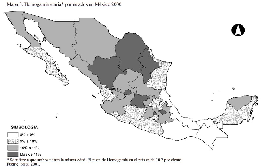 En el Mapa 3 se observan los mayores y menores niveles de homogamia por estados. Las entidades con mayor igualdad de edad entre los cónyuges son aquellas con mayor avance en su etapa transicional, como el Distrito Federal (11.3 por ciento), Tlaxcala (11.2 por ciento), Nuevo León (12 por ciento), Coahuila (11.9 por ciento), Durango (11.3 por ciento), Guanajuato (11.1 por ciento) y Aguascalientes (11.6 por ciento).