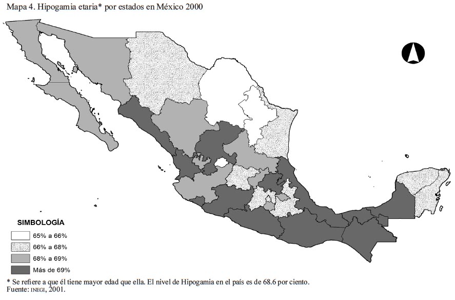 Finalmente en el Mapa 4 se muestran los niveles de hipogamia etaria más altos encontrados, que presentan el comportamiento tradicional del matrimonio en México y están en la zona sur y pacífico del país, en donde los estados de Chiapas, Tabasco, Campeche, Veracruz, Oaxaca, Guerrero, Michoacán, Colima, Nayarit, Sinaloa y Zacatecas son los representantes con porcentajes superiores a 69 por ciento. Se confirma que lo anterior coincide con el grado de avance en su transición, a la urbanización y al desarrollo económico y social de la región. En estos estados la diferencia de edad entre cónyuges es grande, con mayoría de matrimonios donde el hombre es quien tiene mayor edad que la mujer. El caso contrario existe en los estados de Nuevo León, Coahuila, Aguascalientes y el Distrito Federal, que presentan cifras entre 65 y 66 por ciento de hipogamia etaria. Nuevo León y el Distrito Federal no siguen en la misma medida la pauta tradicional de casamiento.