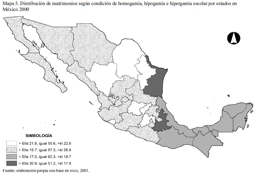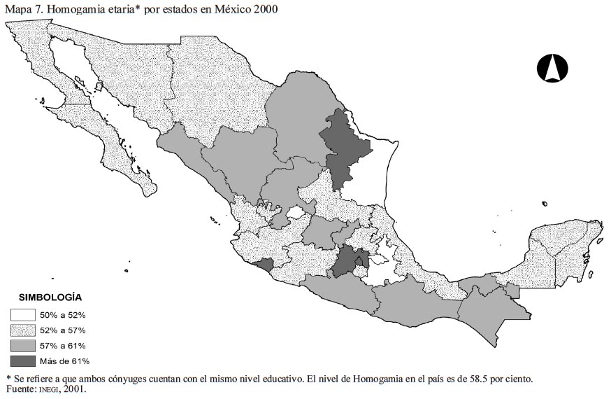 La homogamia educativa a nivel nacional según estados se presenta en el Mapa 7, que muestra la información acerca de los matrimonios de individuos con la misma pertenencia de clase. En el mapa se ven los estados con mayores niveles de homogamia educativa, que son el Distrito Federal (65.5 por ciento), Estado de México (62.5 por ciento), Colima (63.1 por ciento) y Nuevo León (67.8 por ciento), lo cual puede deberse a que todos, excepto Colima, son estados con una etapa muy avanzada en la Transición Demográfica niveles bajos de fecundidad y de mortalidad, altamente urbanizados, con bajos índices de marginación urbana y alto grado de desarrollo. En ellos las personas permanecen en la escuela más tiempo, en especial las mujeres.