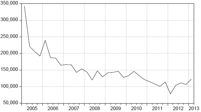 However, migration intentions (PEAC)2 persistently declined from 4.7 per thousand in 2005Q1 to 1.7 in 2010Q4. In absolute terms, the ENOE reported a 70 per cent decline; from 343 000 in 2005Q1 to 102,190 in 2014Q1 (INEGI, 2014) (Figure 1).