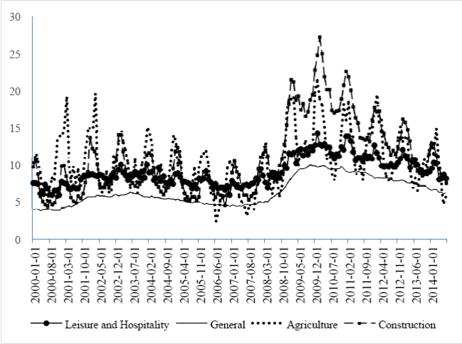 Figure 2 depicts unemployment rates in the construction, leisure and hospitality, recreational and agricultural sectors. Also shown are the rates of unemployment in the U.S. between October 2000.1 and 2014.7. A great disparity between unemployment in these economic sectors can be detected, but also that by the end of 2009 unemployment in construction and agriculture doubled.