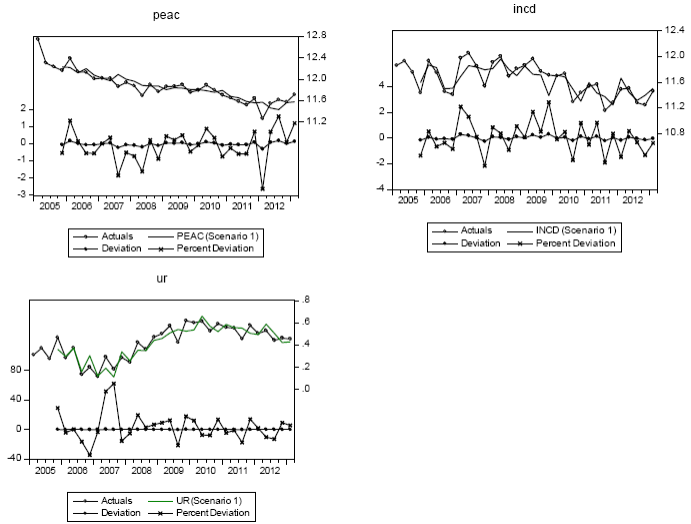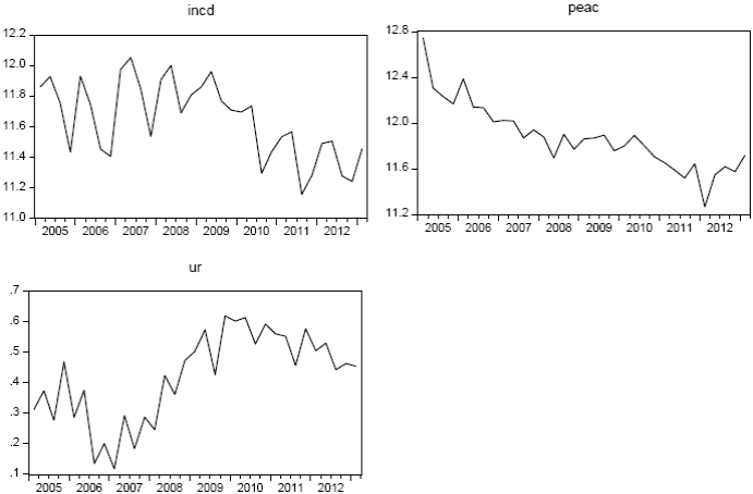 Source: the data was taken from the National Occupational and Employment Survey (ENOE) and from the National Institute of Statistics and Geography (INEGI), and refers to Mexico's economically active population with intention to migrate (PEAC). Mexico's unemployment rate (u) was taken from the same source; deportations of non-criminal immigrants (INCD) was taken from the Enforcement Integrated Database of the U.S. Department of Homeland Security (2011); and the US unemployment rate (uss) is from the U. S. Bureau of Labor Statistics (2014). The relative unemployment rate of US to Mexico (uss/u) is ur. There is no previous data and thus the period is considered as long term.