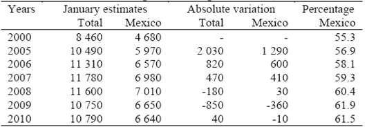 In the 2000's, undocumented Mexican immigrants represented little more than 60 per cent of the total population residing unlawfully in the U.S., and the number of unauthorized Mexicans was close to 6.6 million (Table 1, Hoefer et al., 2011). Since 2005 there has been a considerable decline in new arrivals.
