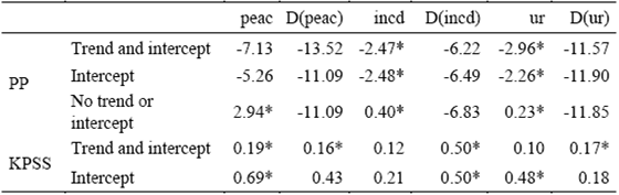 It is convenient to point out that the economic theory usually refers only to long-run equilibrium relationships, leaving the dynamic adjustments to mathematics and to the data structure. According to the modern time-series approach, it is necessary to deal not only with the long run parameters but also with the short run disequilibrium by letting the data freely speak. This is a specific feature of the VECM methodology because it allows the data to indicate the adjustment properties and, therefore, the statistical relation of the series in the short and long run (Hoover et al., 2008; Juselius, 2006; Lütkepohl and Krätzig, 2004).