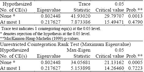 Given that all variables are stationary in their first differences (see unit root tests in Table 1A in the appendix), it is appropriate to use the Johansen (1988 and 1992) cointegrating procedure by which long-run relations and the corresponding error correction model can be obtained (Figure 3).