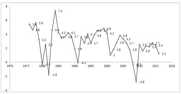 Figura 1: Tasa de crecimiento del Producto Interno Bruto de Estados Unidos 1976-2016 (a precios de 1988)