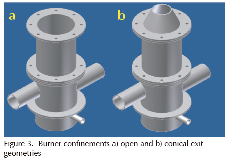 First experiments were made with no confinement attached to the combustion chamber. However, as most practical flames do not discharge into free air, for much of the work, confinements from previous experiments (Syred, 2006; Valera et al., 2009) were used, with open and conical exit nozzles, the latter being the most representative of industrial burners (Figure 3).