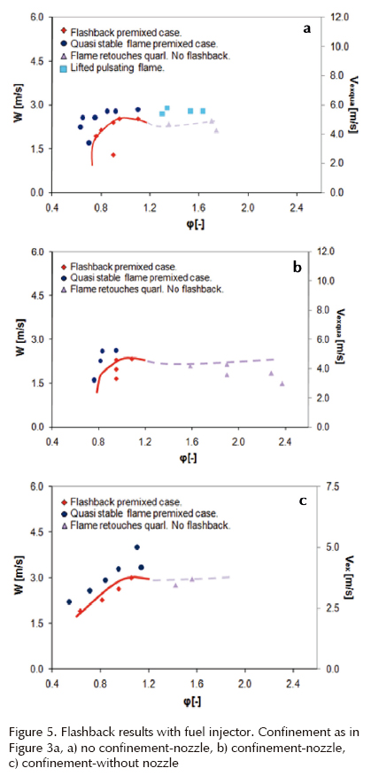 Figure 5 shows three flashback curves with the fuel injector. The improvements in flashback occurrence are very clear and emphasize the advantages of the use of the injector for all cases.