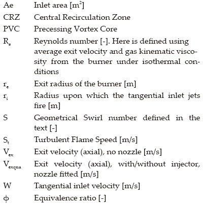 Two different modes of natural gas injection were possible, a diffusive mode with fuel injected along the central axis from the burner baseplate and a premixed mode with entry in one or both tangential inlets, located before the inserts used to regulate the Swirl number. Premixed gas injectors, extending across the inlet ducts, were located just before the inlets. Turbulence is generated by the ducts which cross the inlet area and increase the mixing previous to the entrance of the mixture into the swirl chamber. Overall equivalence ratio, φ, with 5% uncertainty due to the variations in the air and gas flows is reported, as well as the fuel proportion injected diffusively by the fuel injectors mounted along the axis followed by that injected as premixed in the tangential inlets. The following nomenclature was used to describe the relative quantities of fuel injected diffusively either through the center of the baseplate or via the fuel injector and premixed through injectors upstream of the tangential inlets: i.e., {25-40} means that 25_l/min was injected diffusively, 40_l/min premixed. To modify φ, the air supply was kept constant during the test whilst varying the gas supply until flashback was observed. The experimental conditions are at 288K and sea level atmospheric pressure.