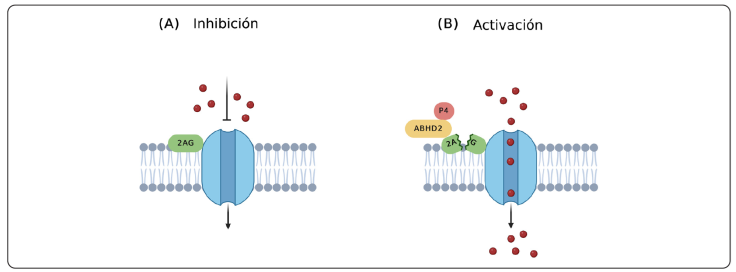 Figura 5 Estimulación del canal CatSper por progesterona. (A) Inhibición de CatSper por el endocannabinoide 2-araquidonoilglicerol (2-AG). (B) Es posible que la activación del canal sea estimulada por la unión de P4 a través de una proteína α/β hidrolasa del dominio serina, proteína 2 (ABHD2), lo que promueve la degradación de 2-AG producido en la membrana plasmática del espermatozoide, activa el canal y permite así la entrada de Ca2+ al interior del espermatozoide (Miller et al., 2016).