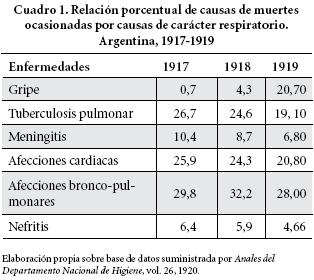 La primera oleada generó una mortalidad relativamente baja, en las regiones más afectadas ocasionó 2 237 muertes. Este número no era habitual, ya que en 1917 la mortalidad por gripe había sido sólo de 319 casos. La segunda oleada, la del invierno de 1919, provocó 12 760 muertes. Es decir, entre 1917 y 1918 la mortalidad por gripe se multiplicó por siete, y entre 1918 y 1919 se multiplicó por cinco. Lo cierto es que la epidemia de gripe española dejó un saldo en las provincias argentinas6 de 14 997 muertes7 en 1919, la gripe se constituyó, junto a otras afecciones de carácter respiratorio, en una de las principales causas de muerte. En el cuadro 1 se puede apreciar el lugar ocupado por la gripe como causa de muerte entre 1917 y 1919 en relación con otras afecciones de carácter respiratorio.